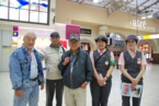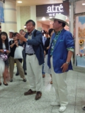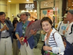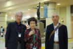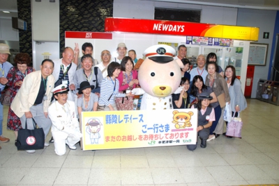 木更津駅に到着すると、改札前で横断幕を持った制服姿の木更津駅長さんとゆるきゃらの「駅長犬」のサプライズなお出迎えを受け、皆さん大感激。駅前からは2台のバスに分乗し、ホテル「三日月」へ移動です。バスの中は立つ人もいて少々窮屈でしたが、おしゃべりをしているうちに到着しました。
