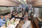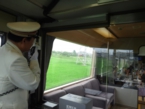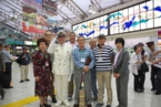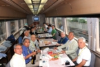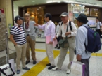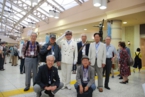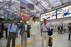 当日は今にも雨が降りそうな天気でしたが、JR上野駅中央改札前の受付には受付開始時間前から続々と参加者が集まってきました。JRのご協力もいただいて大変スムーズに受付は進み、予定時刻には参加者全員が集合しました。太田氏が上野駅長の白い制服で登場し、皆さんと記念写真に納まっていました。乗車車両毎に色分けした名札をつけて上野駅16番線ホームへ移動しました。16番線のお知らせ掲示板には「☆★上野発 お座敷列車の旅★☆」と表示され、出発前から感動してしまいました。お座敷列車「ゆう」へ乗車し、上野駅を予定通り9時20分、6号車を先頭に発車しました。ホームでは飲物等の積込を手伝って下さった上野駅員の皆さん20名以上の方が見送って下さいました。