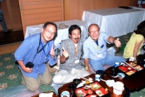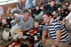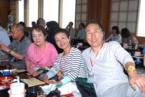 5階の宴会場「なぎさ」では、23期荒木(i)氏にお願いして、まず全員の集合写真撮影。人数が多いのでうまく並びきれず少々手間取りました。雄大な海の眺望が自慢の宴会場ですが残念ながら曇り空。浜には潮干狩りをしている人もいました。座席はいろんな方と交流して頂けるよう、列車内で抽選をして場所を決めました。会長・9期平沢氏の挨拶を頂いたあと乾杯。音頭はレディース行事らしく女性1期生の3期松澤さんにお願いしました。JRの方がたからお酒を1升瓶・11本もの差入れて頂き、余ったらどうしようという心配は全く杞憂に終わり、全て呑み切りました。歓談後、26期太田上野駅長(当時)のオンステージの始まりです。白い制服から衣装替えしてギターを片手に懐かしい歌が続きます。26期・同期の皆さんのご協力などもあり、全体で大合唱となりました。その後、中締めとして33期清水君の指揮のもと、校歌斉唱・覇権の剣・信濃の国と続けて皆さんで歌いました。自由タイムには温泉に入ったり宴会場で話の続きをする人など思い思いにゆったりと過ごしました。
