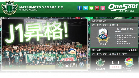 ついに松本のプロサッカーチーム、松本山雅が10月にJ1昇格を決めました。1975年に北信越リーグ加入、10年にJFL、11年に元日本代表松田直樹選手の招聘、12年にJ2とその実力をつけ、J2参戦3年目の本年、12→7→2位と史上最速でのJ1昇格を果たしました。1965年創部。来年50周年を迎える歴史あるチームです。