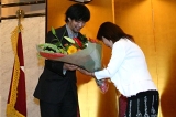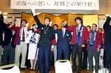 さあ最後のクライマックスはもちろん、これ。信州人なら、縣陵生なら、これがなくてはすまされぬ「信濃の国」「覇権の剣」の斉唱。応援団を先頭に28期のみなさんが壇上に上がる中、山崎監督もはっぴをまとって飛び入り参加。「フレフレ縣陵」が響きわたり、会は最高潮!この勢いを来年につなげようと、実行委員会のたすきが29期のみなさんに引き渡され、空前の盛り上がりの中、会は閉幕しました。