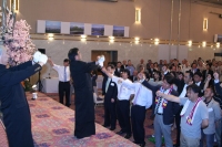 133個にも上る景品による抽選会が盛大に行われ、雰囲気が盛り上がった後は学ラン姿の応援団4名が登壇し、いよいよ覇権の剣の斉唱です。当時の応援練習そのままの怒声、発声練習など応援団の体型は変わってもその迫力に衰えはありません。何歳になっても、どこに居ようとも、覇権の剣を歌うだけで心を一つにできる県陵同窓生。素晴らしいと思います。