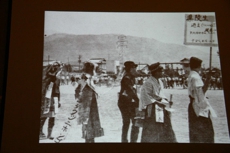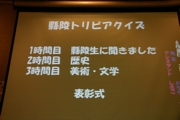 ひとしきり料理とおしゃべりを楽しんだあとはお楽しみ、アトラクションその1。テーブル対抗縣陵トリビアクイズ。よく行った店、思い出に残るイベントは?など、なつかしさ満載の設問に、各テーブルでごにょごにょと相談して答えを出し、番号カードをかざします。歴史問題では年配の方が本領発揮。松本の風土に関する問題などはなかなかむずかしいものもあり、「へえ~~」の連続でした。スライドでは設問に関する当時の写真資料なども多数紹介され、わが母校の歴史の重みを
