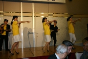 続くアトラクション第2弾は、歌って踊れる実行委員会!というわけで、往年のヒットソングをステージで熱唱+ダンス!ティーンエイジャーに戻ってしまいそうなキュートな女性陣と、蛮カラ県陵生の熱演に全員釘付けでした。 練習もかなりハードだったに違いありません。なりきりザ・ピーナッツ、「あいつはかわいい県陵の男の子」にキャンディースもよみがえります。