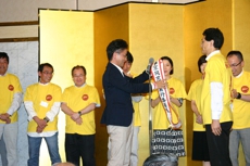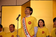 第二の校歌、「覇権の剣」斉唱のあと、イエローのユニフォームで壇上に勢揃いした来期36回卒のみなさん。松澤35回実行委員長から、これまた松澤36回実行委員長へ、恒例のたすきリレー。一年後の再会と、東京同窓会のさらなる発展を願い、最後のプログラムに信濃の国を斉唱し、多いに盛り上がった東京同窓会は終了しました。参加されたみなさん、実行委員会のみなさん、ありがとうございました。